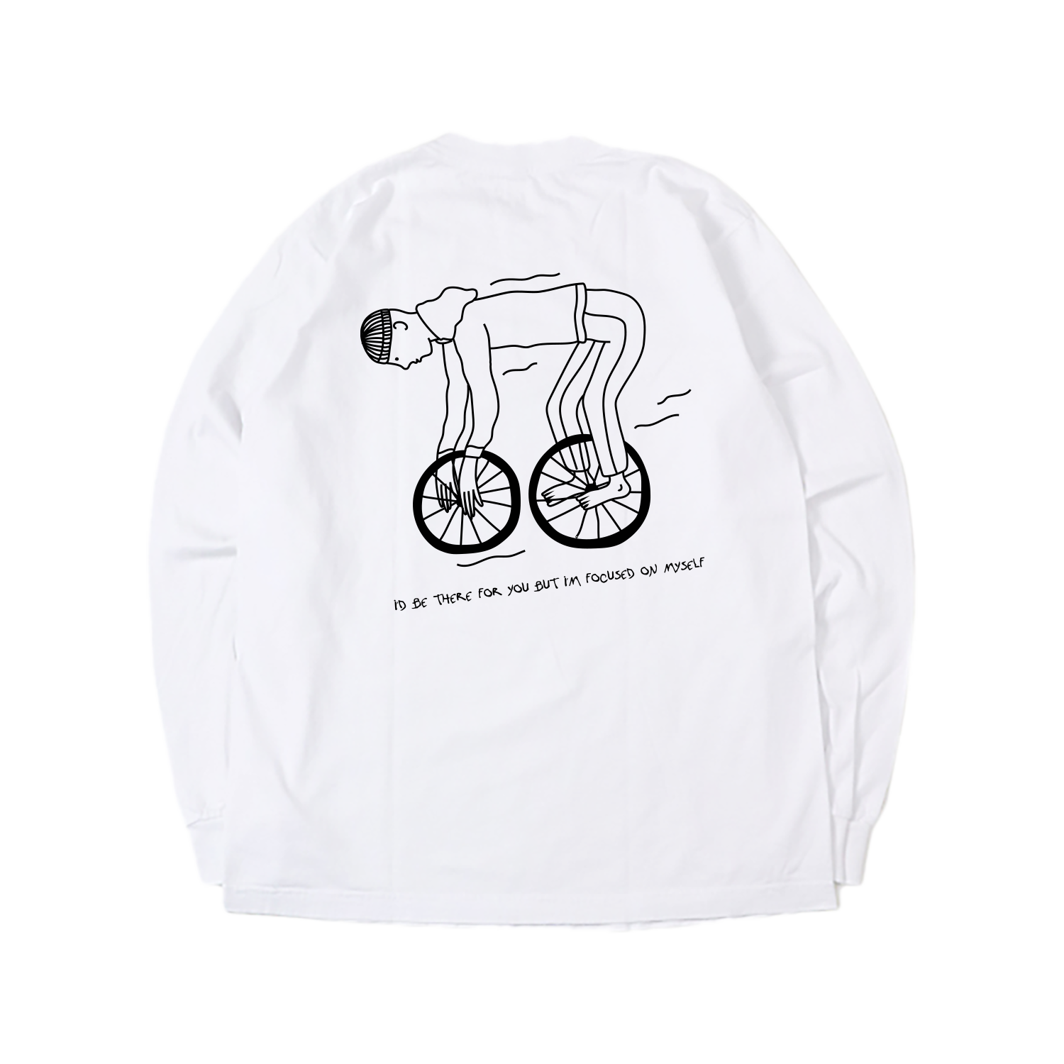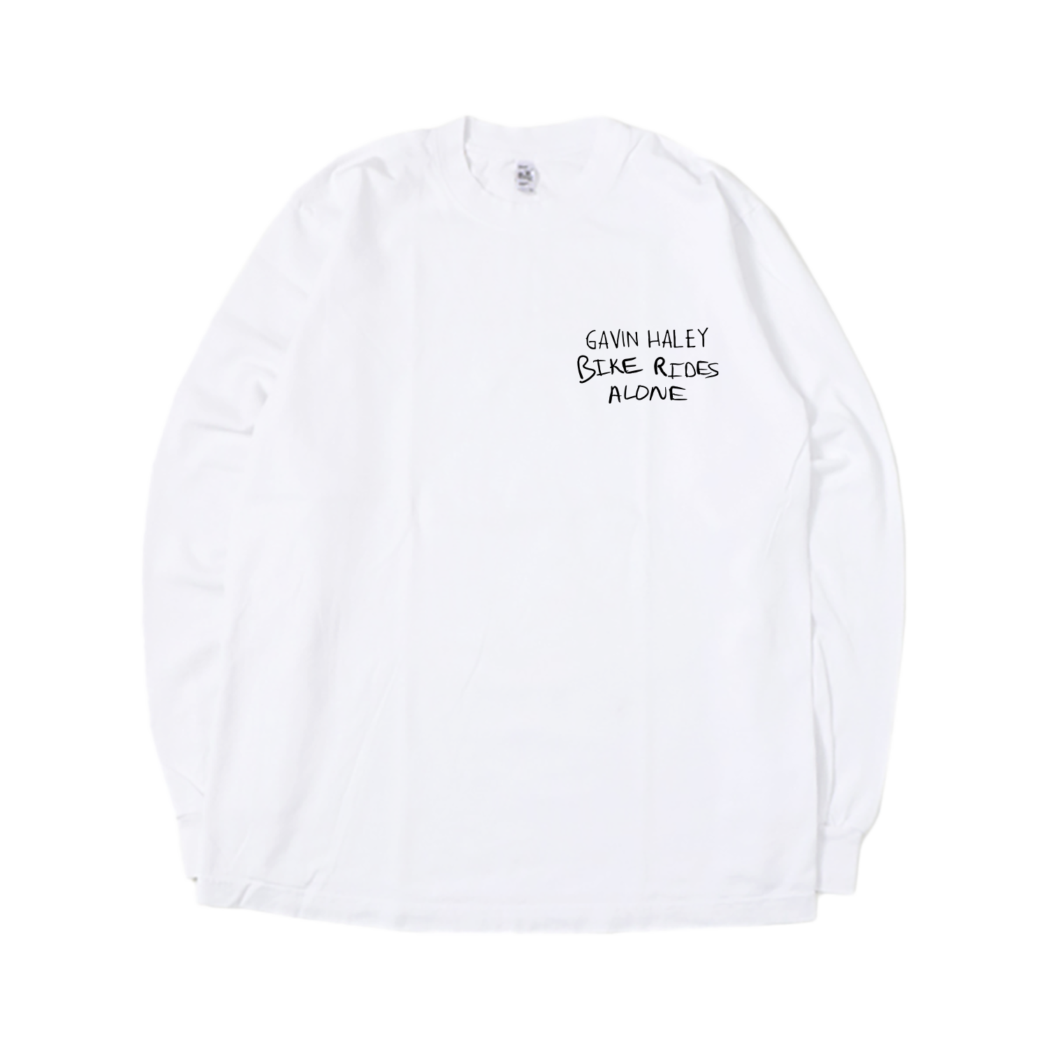 New from Gavin Haley. Bike Rides Alone double-sided crewneck long sleeve in white.
