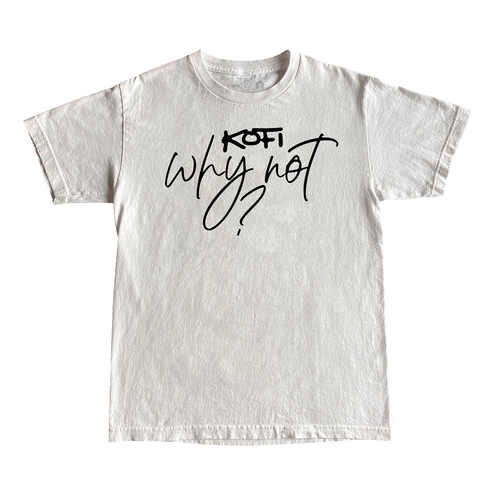 Red Bull Records & Kofi present the Why Not? Tee, with Kofi’s logo on the front and the album title “Why Not?” on the back.