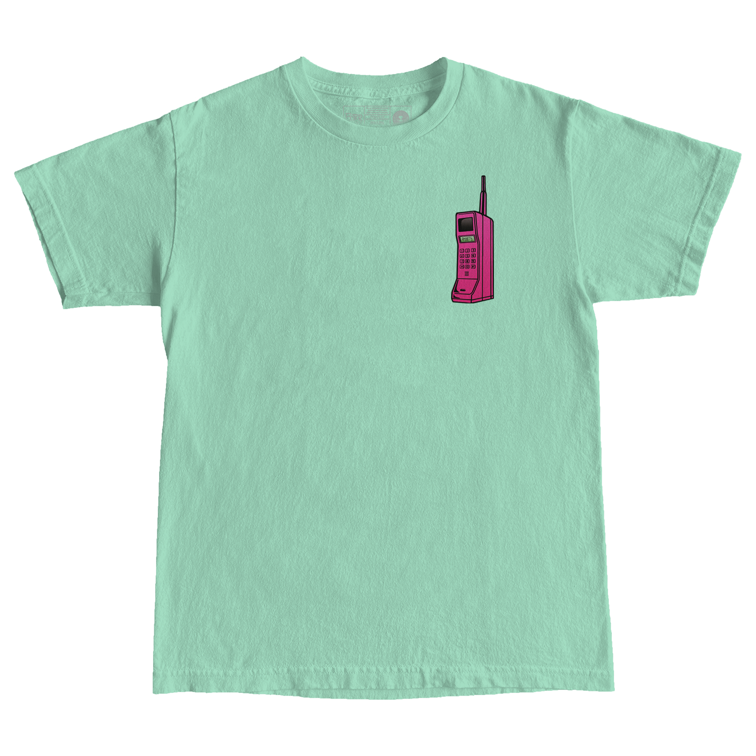 - Green tee with a fuchsia phone on the front, and the PCGA logo on the back in yellow.