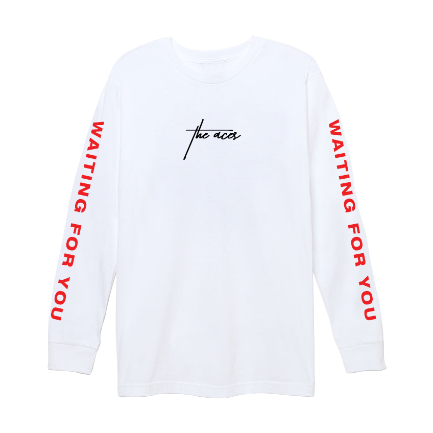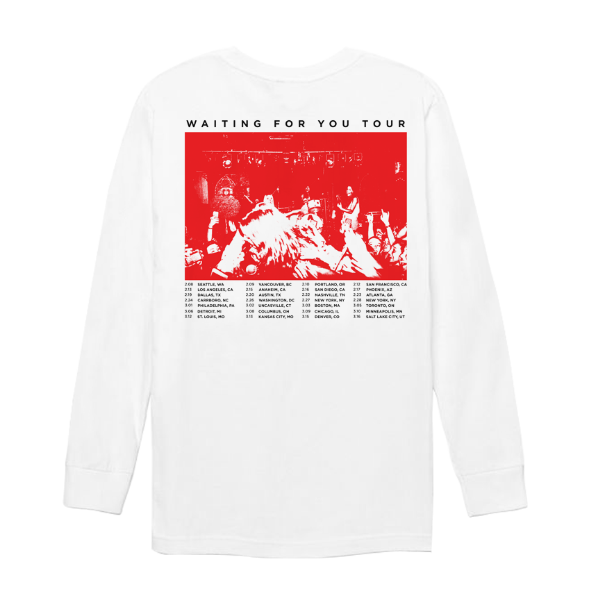 A white long sleeve shirt with print on the front, back, and sleeves. This shirt includes tour dates from the bands spring 2019 headline tour.