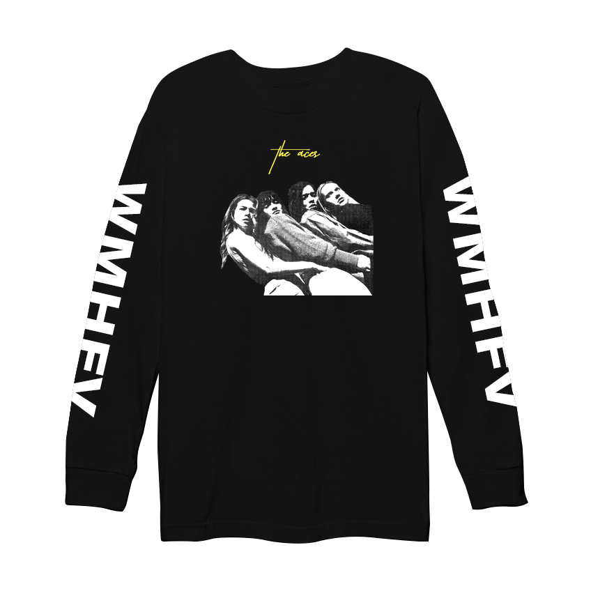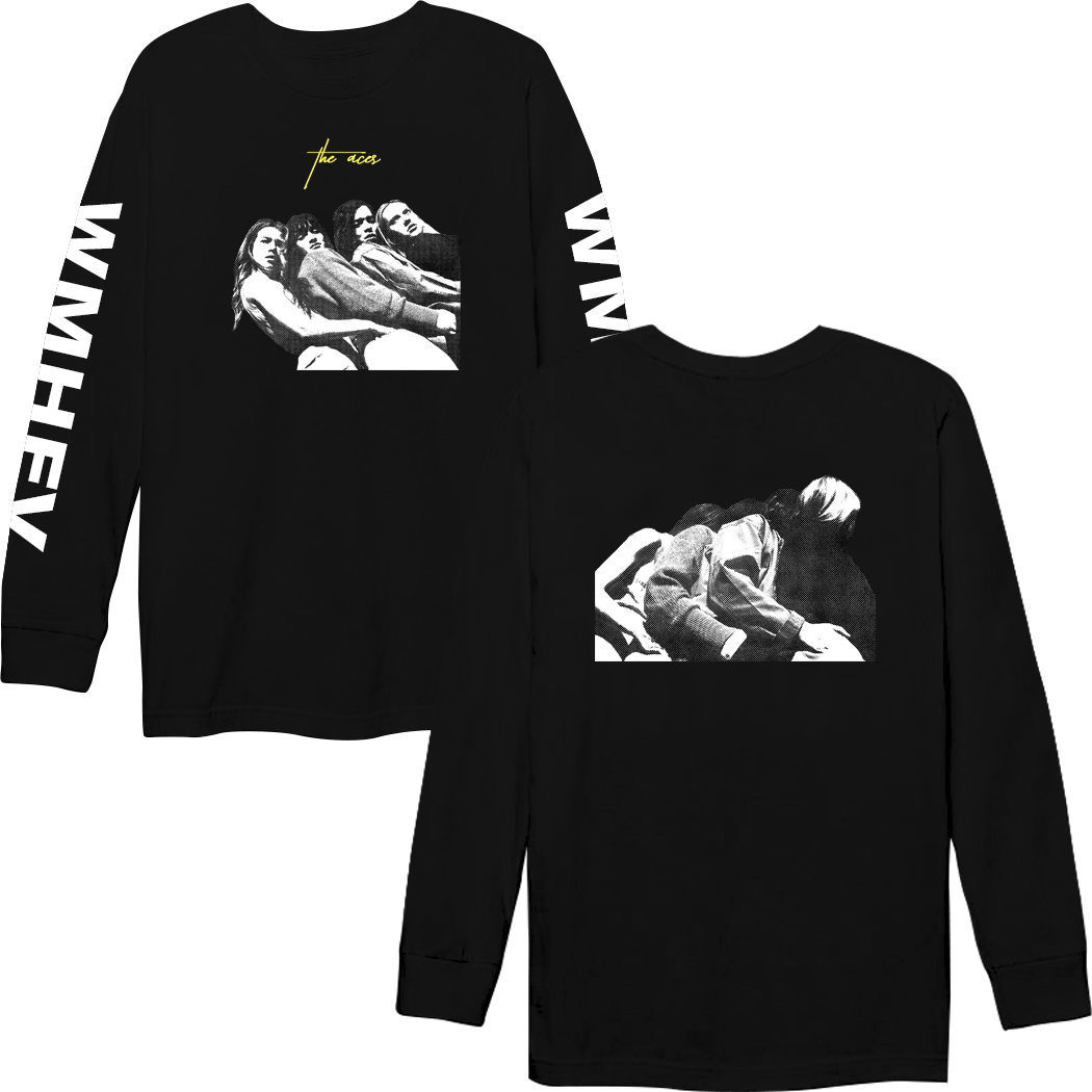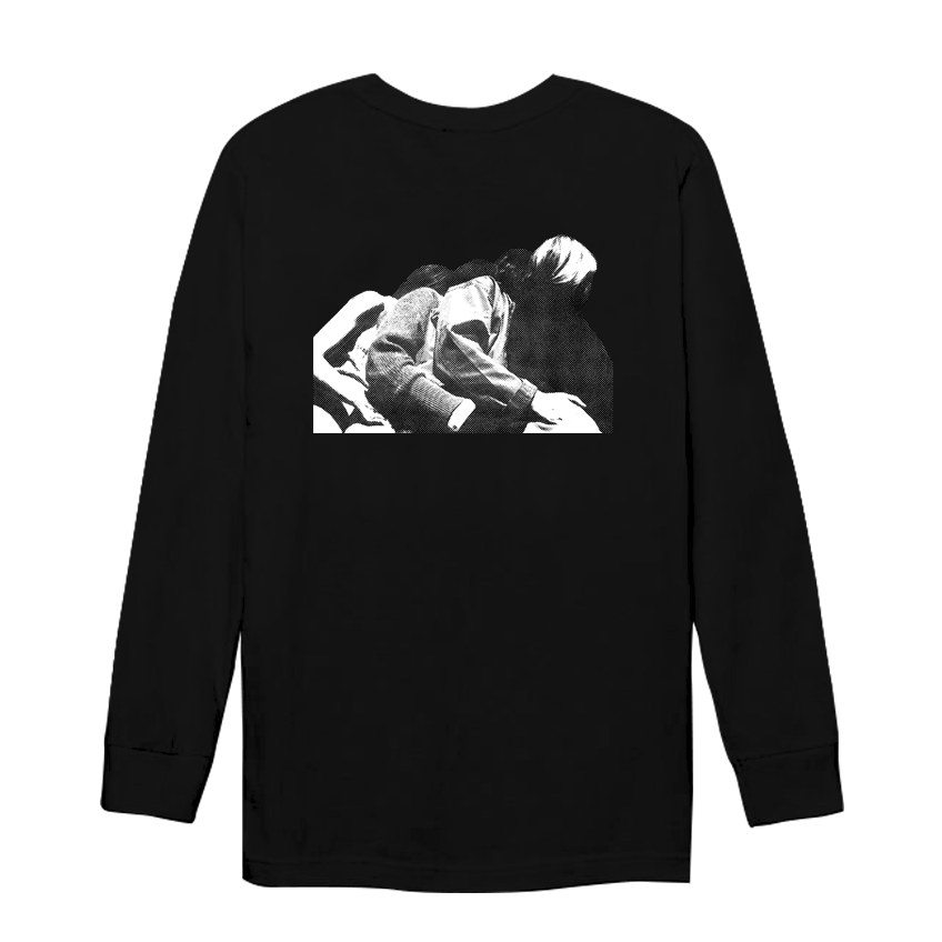 A black long sleeve shirt with print on the front, back, and sleeves.